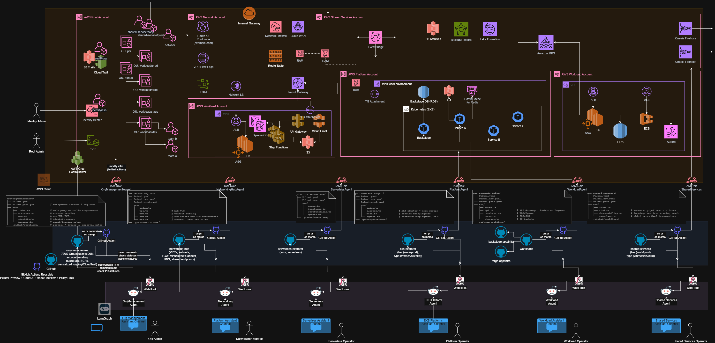 Enterprise-scale, AWS-native, code-first system that integrates Open-SWE style GitHub interactions, Pulumi Infrastructure as Code, and LangGraph-driven domain assistants. Addresses fragmented codebases, operational toil, and security risks by introducing specialized domain assistants that collaborate with teams through deterministic code changes via PRs. Features multi-account AWS landing zone with clear trust boundaries, everything-as-code approach, and comprehensive security guardrails including IAM Identity Center SSO, SCPs, and audit trails.