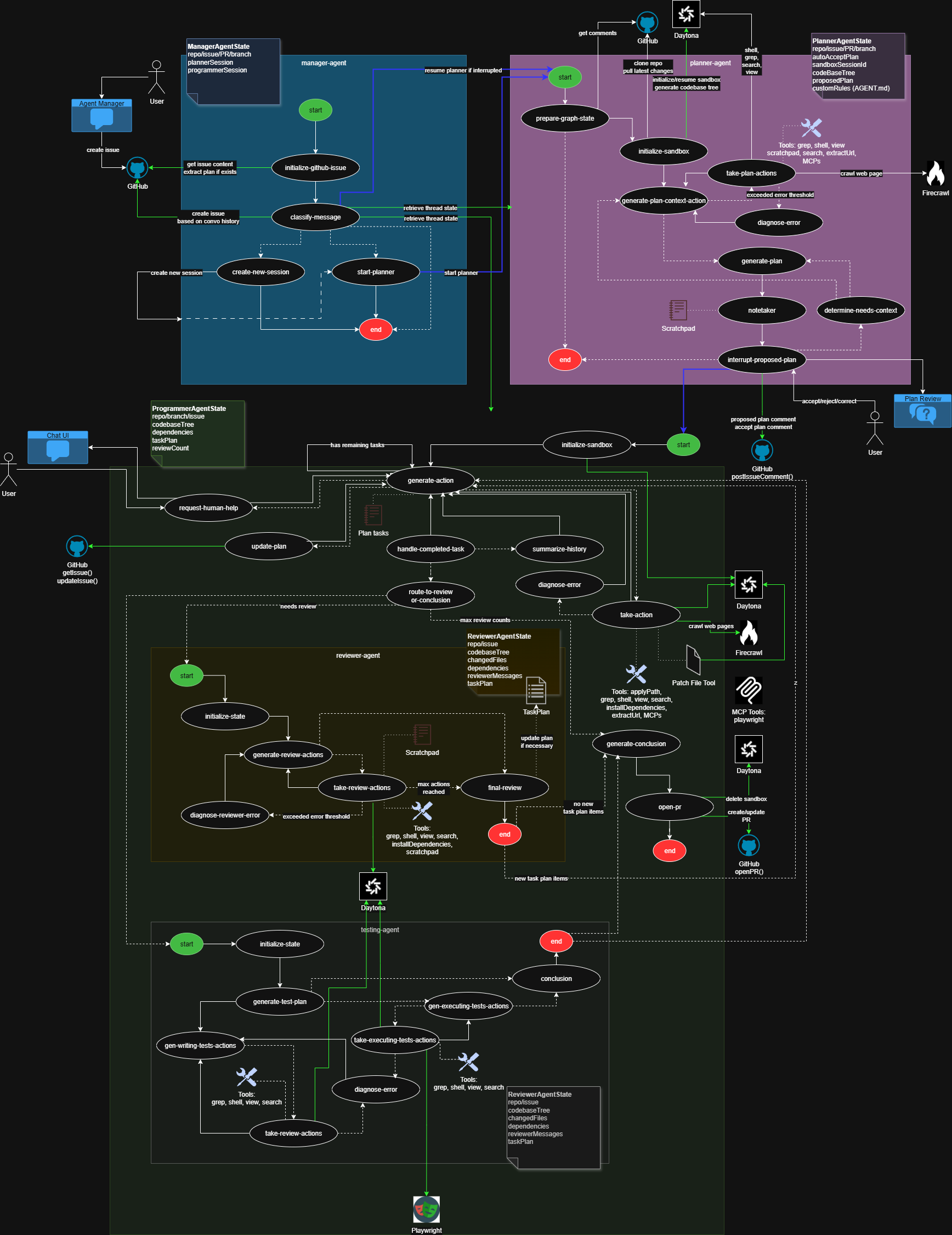 An AI software engineer that automates the complete software development lifecycle—from requirements analysis and architecture design to implementation and testing. Built as an extension of LangChain's Open SWE project, it acts as an autonomous development team member, creating production-ready code, comprehensive test suites, and maintaining high software quality standards for enterprise organizations. Features specialized agents for planning, programming, reviewing, and testing, with seamless GitHub integration for issue-to-PR workflows, automated code reviews, and enterprise compliance checking.